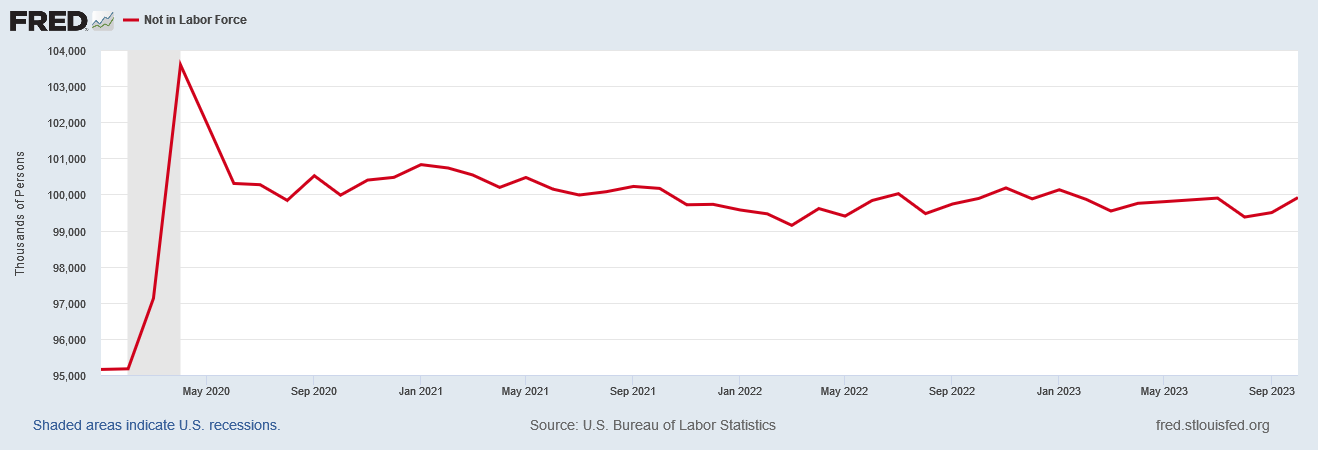 Wall Street also overlooked that the number of people not in the labor force increased for the second month in a row on a seasonally adjusted basis. We are coming up on four years since the Pandemic Panic Recession and fully one half of the people forcibly ejected from the labor force by that bit of government lunacy are still stuck on the sidelines.