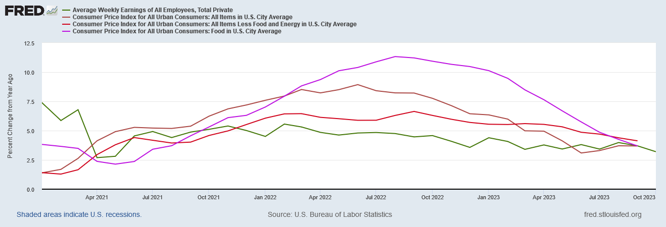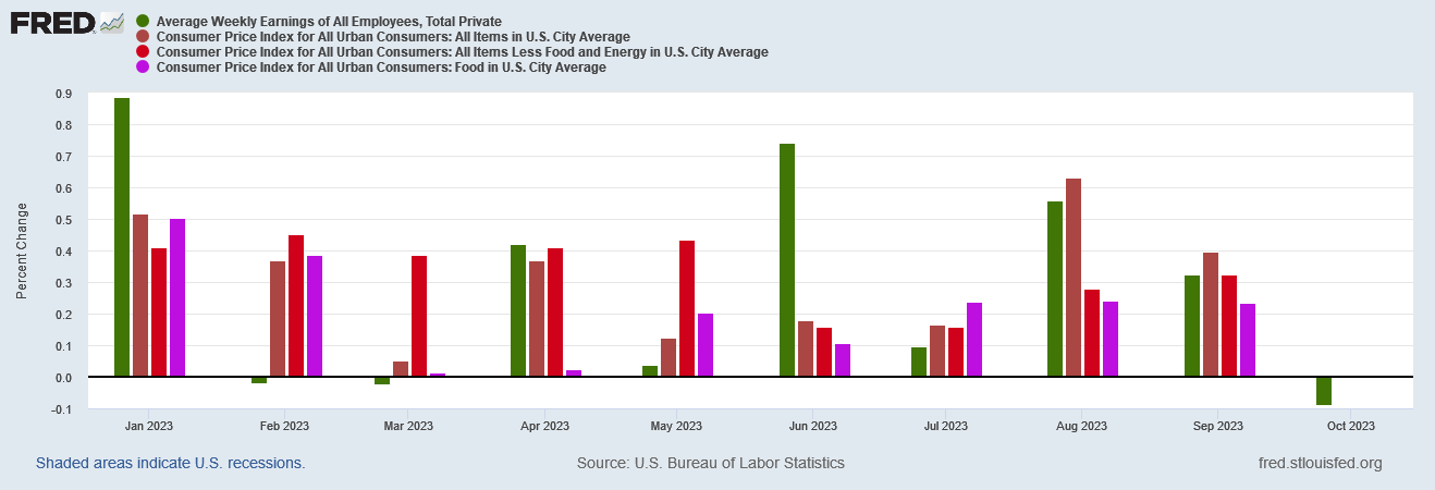 With core inflation stuck above 4% and headline inflation inching up again, while growth in nominal pay decreasing, the brief respite workers have had from declining real paychecks has very likely ended, and inflation is once again set to take bigger and bigger bites out of worker’s paychecks.