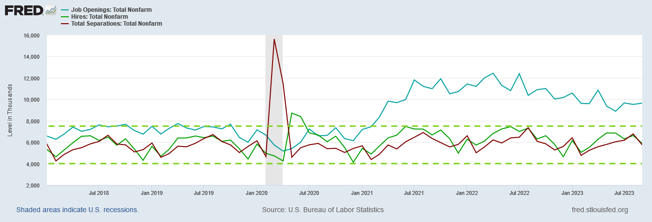 Note that the JOLTS report continues to show the same bizarre tendency of job openings being completely unhinged from the actual hiring and separation trends. Oodles of job openings are being reported, only the hiring data is not reflecting increased hiring.