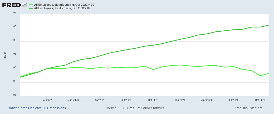 Significantly, at the same time Industrial production began trending down—October 2022—is also when manufacturing employment growth essentially stopped in this country.