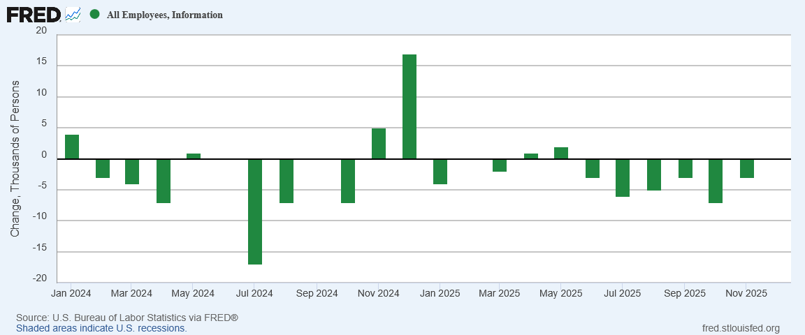 Information also continued to shed jobs (which makes one wonder where the payoffs from Artificial Intelligence will come if the tech sector is laying everybody off).