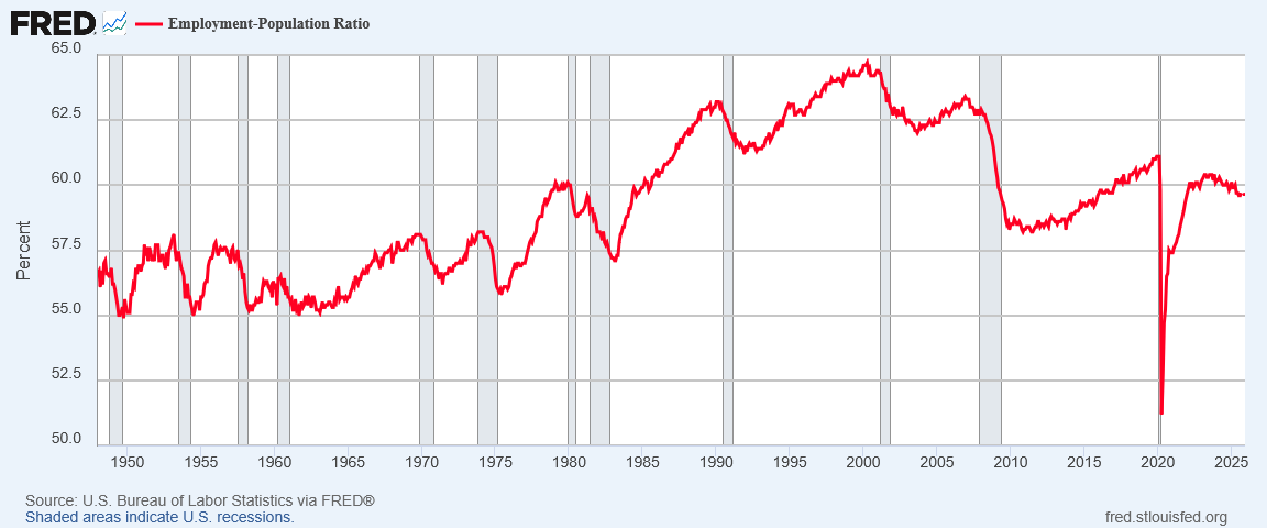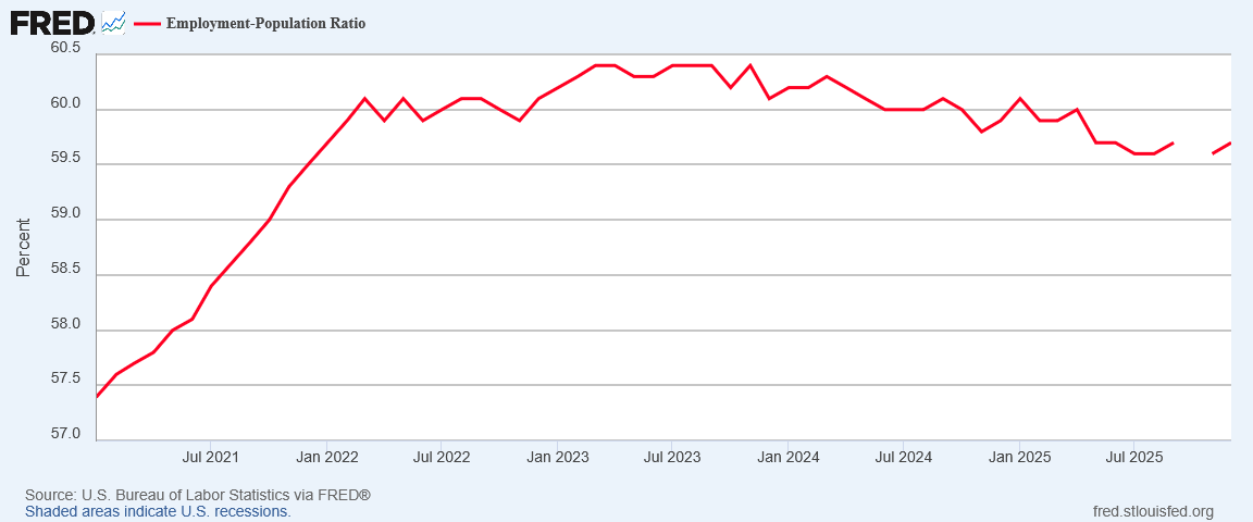 When we step back and look at employment more broadly, we see a clear negative trend in the Employment-Population Ratio going back to approximately late 2023.