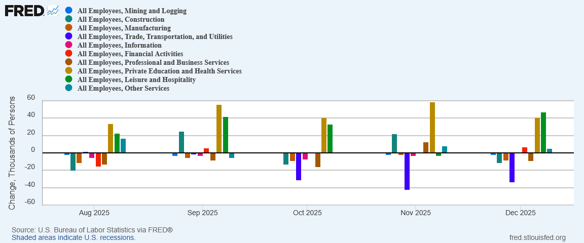 When sector after sector is losing jobs, the jobs report is by definition weak and worrisome. In December, sector after sector once again lost jobs.