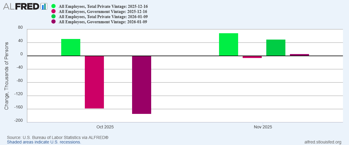 While the October downward revision of government sector jobs might not be seen as a complete negative, the elimination of nearly all private sector job growth in October is absolutely a complete negative. So is a similar correction for November.