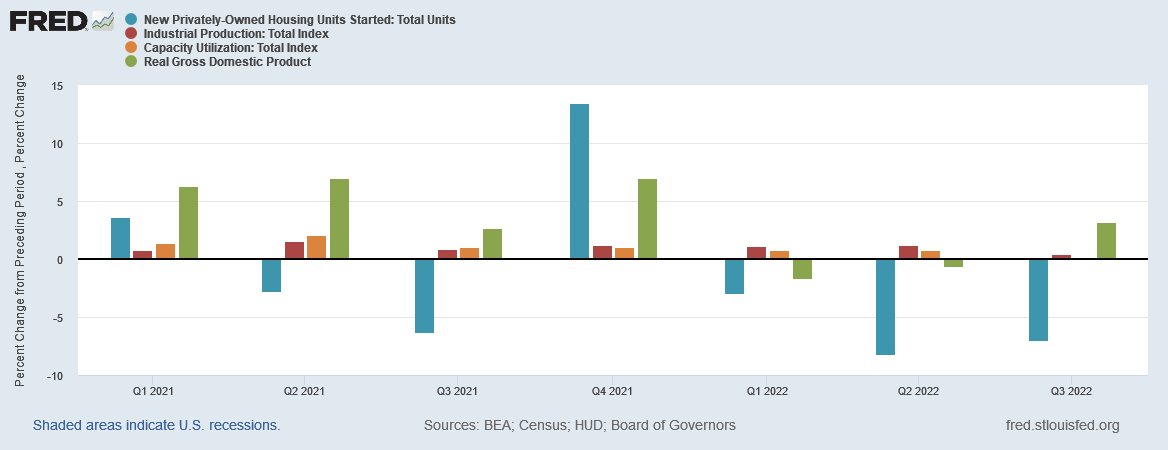 While it is surely good news that industrial production increased by 0.4% during the quarter, it is hardly good news that industrial capacity utilization decreased by 0.01% during that period, and it is very bad news that new housing starts plummeted 6.9% during the quarter.