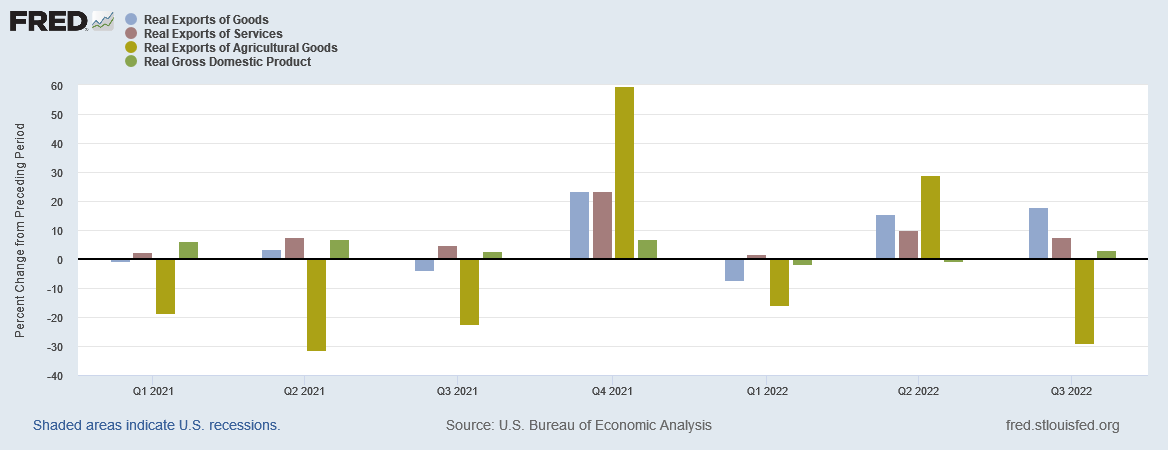 It is good news that the nation’s real exports of goods increased by 17.8% during the quarter, and also good news that the nation’s real exports of services increased by 7.5%. It is not at all good news that the nation’s real exports of agricultural goods fell 28.9% during the quarter.