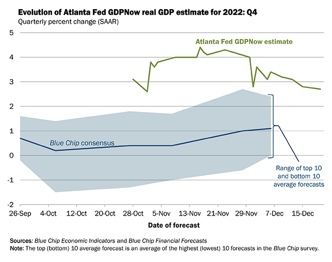 The GDPNow model estimate for real GDP growth (seasonally adjusted annual rate) in the fourth quarter of 2022 is 2.7 percent on December 20, down from 2.8 percent on December 15. After this morning’s housing starts report from the US Census Bureau, the nowcast of fourth-quarter real residential investment growth decreased from -21.2 percent to -21.5 percent.