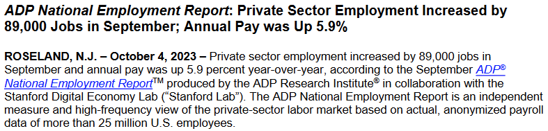 ADP reported 89,000 new jobs in September. The BLS Household Survey reported 86,000 new jobs in September.