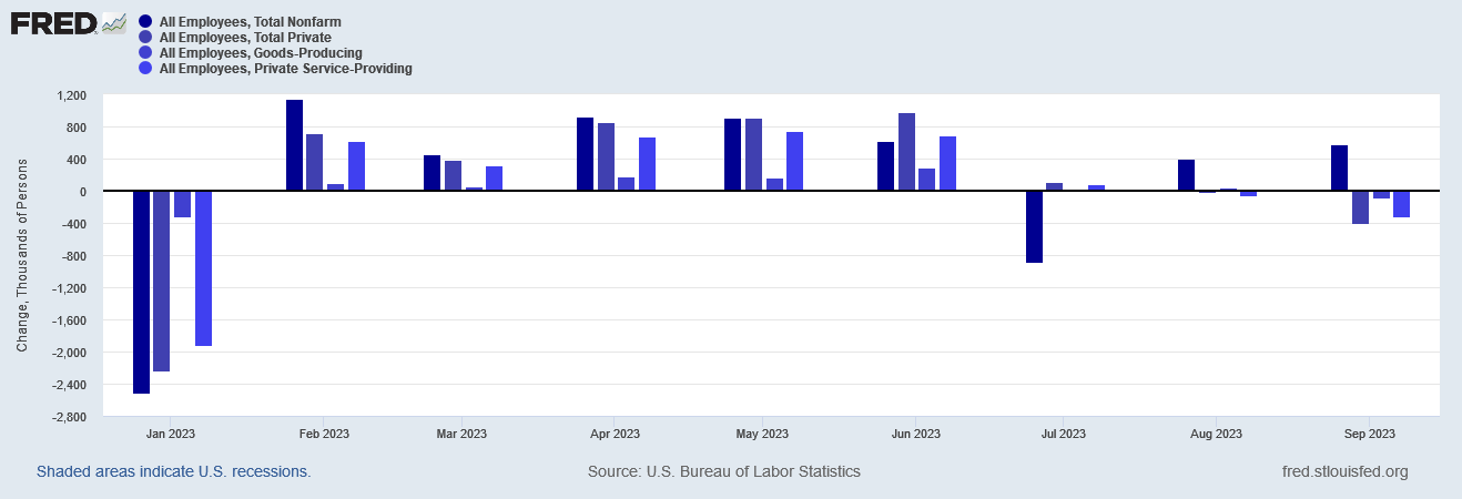 Additionally, the unadjusted data indicates that the gain in employment did not come from the private sector at all. Total nonfarm employment increased, but private employment—including both goods-producing and service-producing jobs—declined significantly.