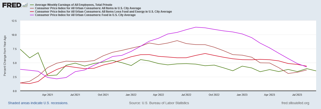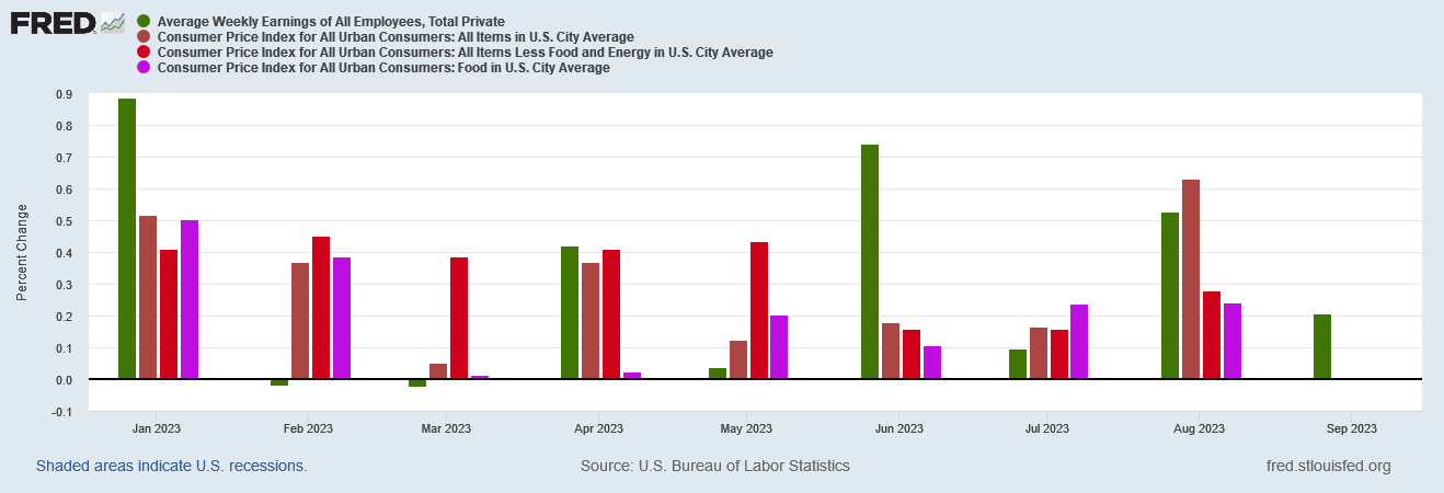 Another less than optimistic trend that we are still seeing is in workers’ paychecks. Not only did earnings decline year on year in September, inflation is still outpacing the payroll.