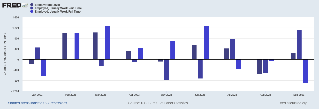 Case in point: the 336,000 jobs created is the seasonally adjusted figure. The unadjusted number of jobs notionally created during the month of September is only 242,000. That might still be considered a good number, but it is achieved by a massive surge in part time jobs and a massive reduction in full time jobs.