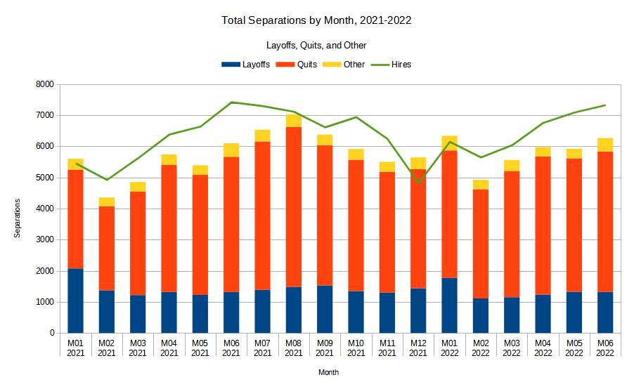 The unadjusted numbers also show the number of quits—voluntary separations—increasing every month since February. There is plenty of hiring activity going on—but people do not appear to be staying settled in their jobs, and there is significant churn in the labor markets at present.