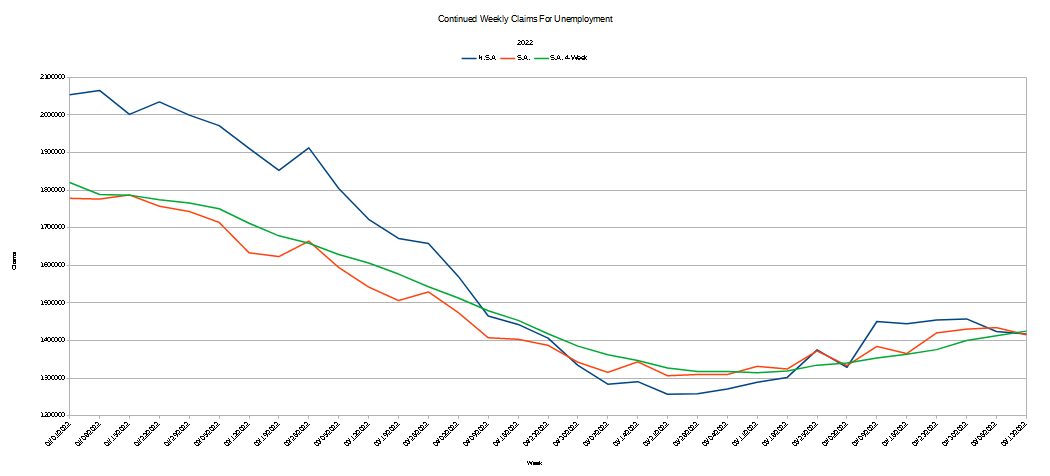 Lending weight to the seasonally adjusted initial jobless claims in spite of the anomalous behavior of the unadjusted data is the data for ongoing jobless claims. The seasonally adjusted moving average shows that continuing jobless claims—claims for unemployment insurance benefits after the first week—have been trending up since May.
