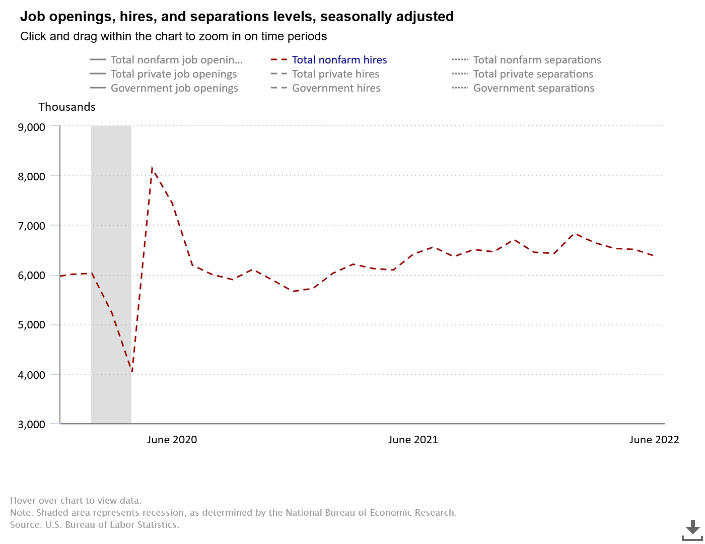 What Powell likely wants to see is a greater decline in the number of reported job openings, even though the seasonally adjusted number of hires has itself declined every month since March.