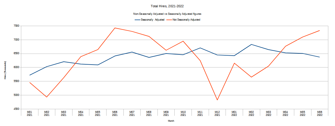 Compare the seasonally adjusted figures to the reported raw data. Will the apparent divergence in total hires continue?