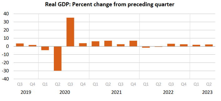 Real gross domestic product (GDP) increased at an annual rate of 2.4 percent in the second quarter of 2023 (table 1), according to the "advance" estimate released by the Bureau of Economic Analysis. In the first quarter, real GDP increased 2.0 percent.