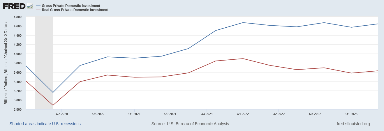 In Q1 of 2022, nominal Gross Private Domestic Investment was measured at $4,671.027 Billion. During Q2 of 2023, nominal Gross Private Domestic Investment was measured at $4,643.501 Billion—$27.5 Billion less.