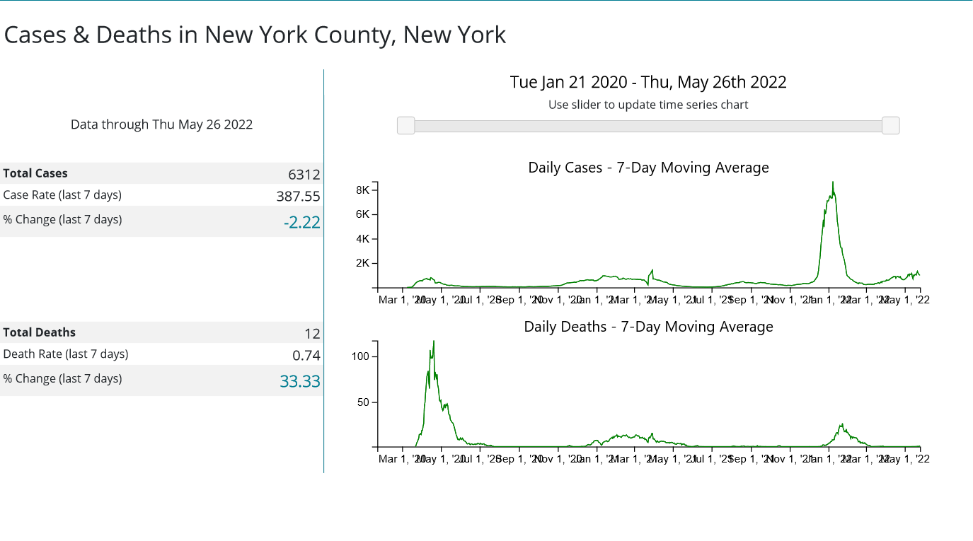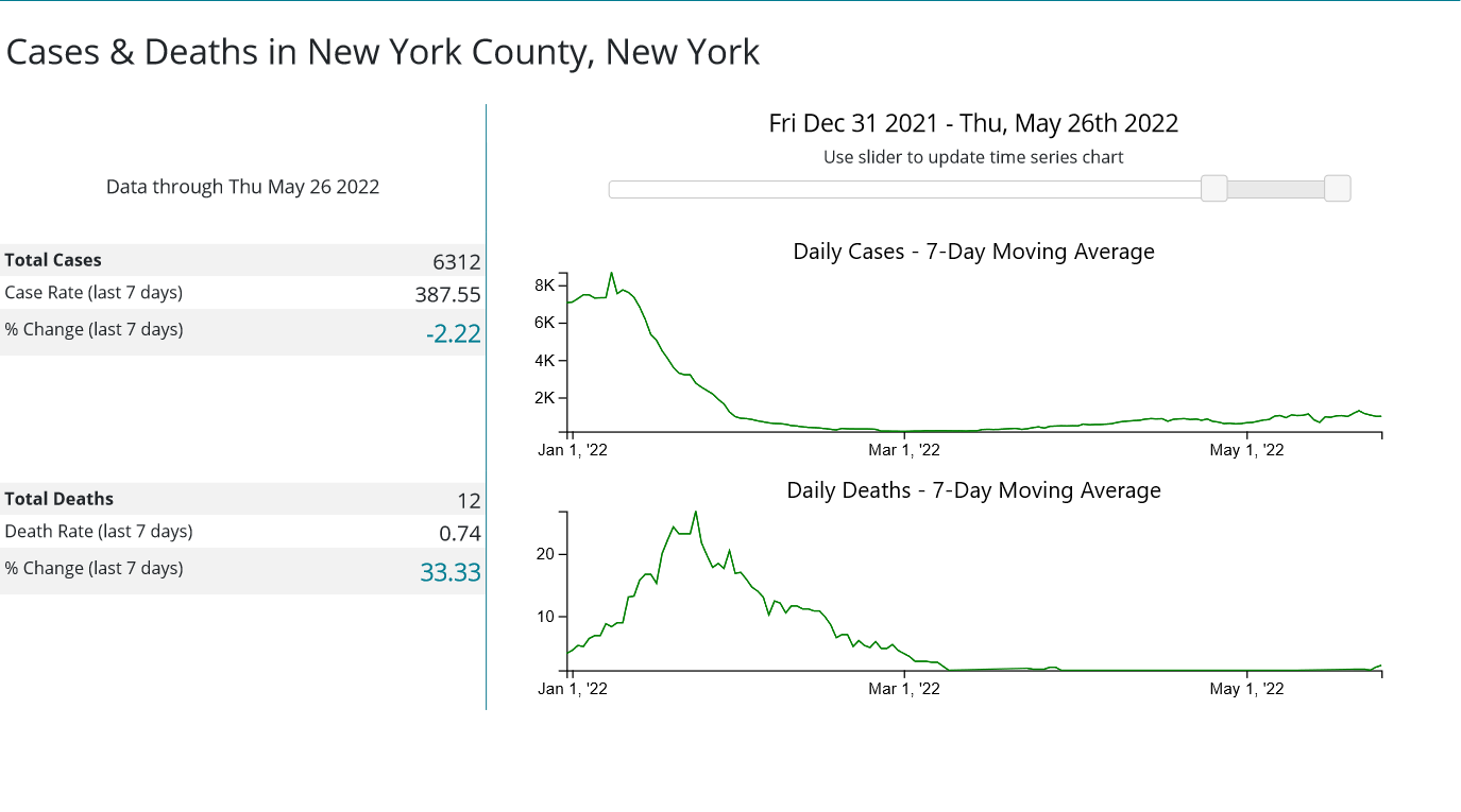 The most recent trough in cases was on April 1, at 26,668 cases—more than double the June 18, 2021 trough of 11,444 cases. A quick glance at the New York County graph shows that cases there are also, overall, higher than at previous troughs.