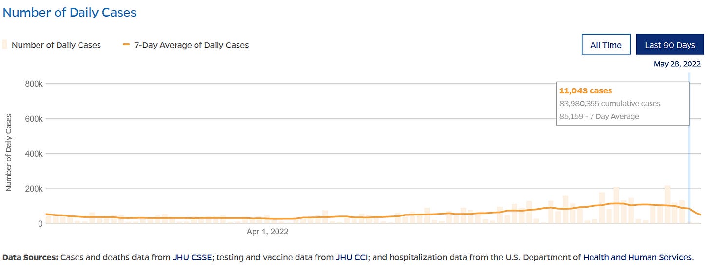 According to the Johns Hopkins Coronavirus Resource Center current figures (as of this writing), the seven-day average for the United States for May 28, 2022, is 85,159. Ms Beale overstates the number by 34,566, or 40.6%. That’s a rather large error of fact.