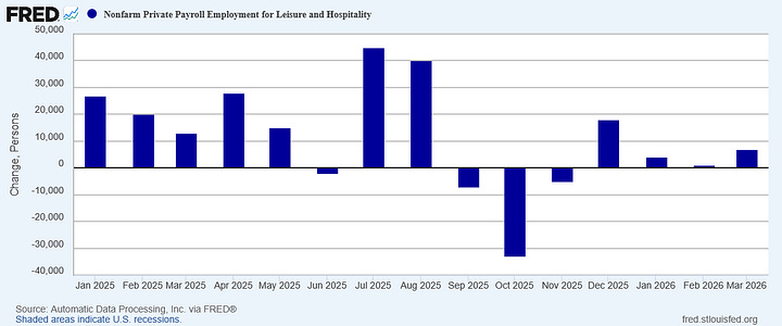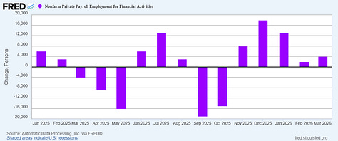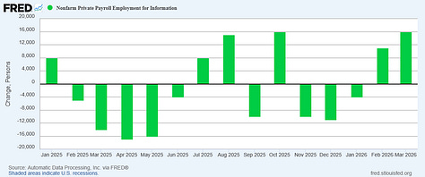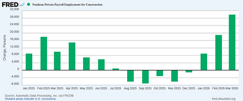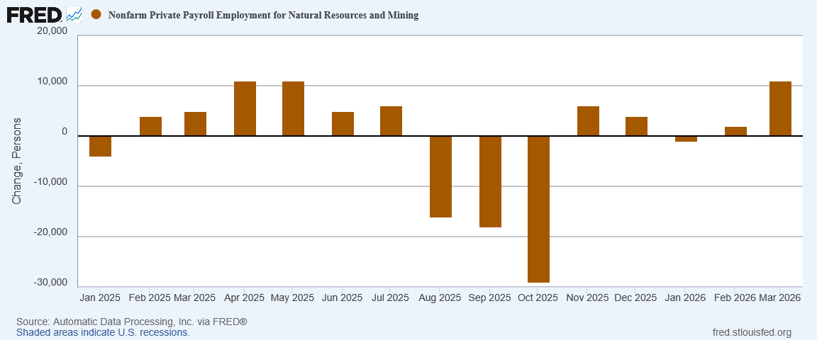 Is the uptick in mining employment part of the network effects from the war with Iran and resultant surge in oil prices? That is a plausible interpretation of the data in context, and while higher energy prices are distinctly undesirable, should they prove a jobs catalyst that would mitigate their negative economic impacts somewhat.