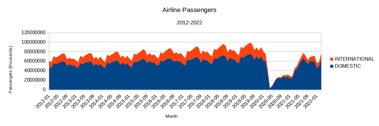 Domestic air travel in March of this year moved 64,515,346 passengers, which is comparable to November of 2019, and more than 10 million below the peak month for air travel pre-pandemic (July, 2019, at 75,281,916).