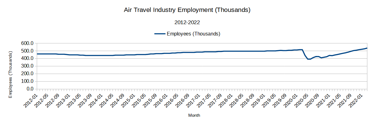 Air travel employment peaked pre-pandemic at 518,100 people in March, 2020, and that level of employment was exceeded in January of this year. Headcount was reduced in the industry, but in aggregate that headcount has already been restored, at least within the US.