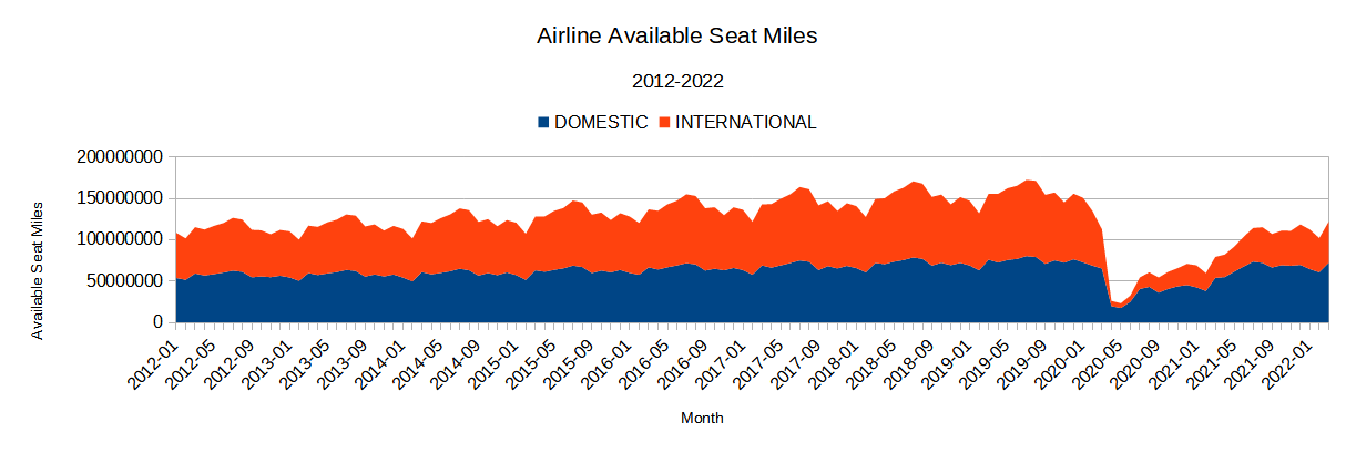 Domestic carriers logged 71,908,413 available seat miles in March of this year, also comparable to end of 2019 right before the pandemic, and well below the July, 2019, .peak of 80,120,972