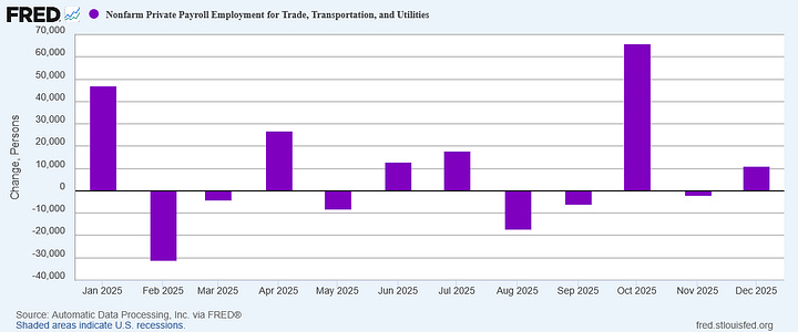 We should note that Trade, Transportation, and Utilities, a major services employment category, did manage a small rebound, both in net hiring for November and in the ADP data for December.