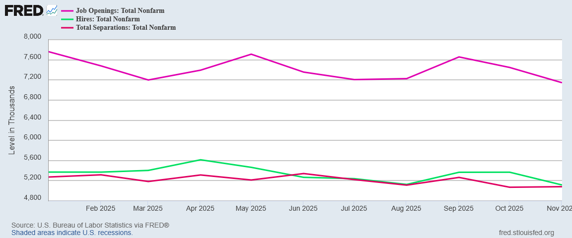 The second jobs report was the Bureau of Labor Statistics November Job Openings and Labor Turnover Summary, which charted a significant plunge in net hiring for the month—all the while hewing to the BLS’ standard JOLTS refrain of “little changed.”