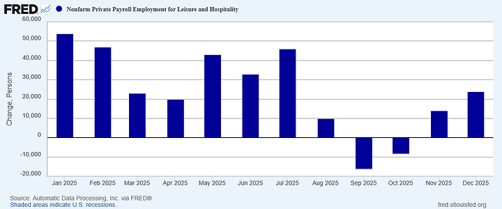 Leisure and Hospitality turned in a mix performance, with net hiring for November printing job losses while ADP showed continued job gains.