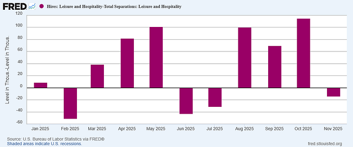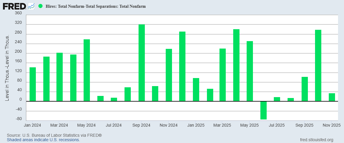 Zeroing in on the data from 2024 onward, November’s net hiring figure was a major drop-off from October’s.