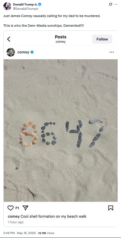 On Thursday, Comey shared a picture on Instagram of seashells on a beach arranged into the numbers "8647." The caption read: "Cool shell formation on my beach walk."