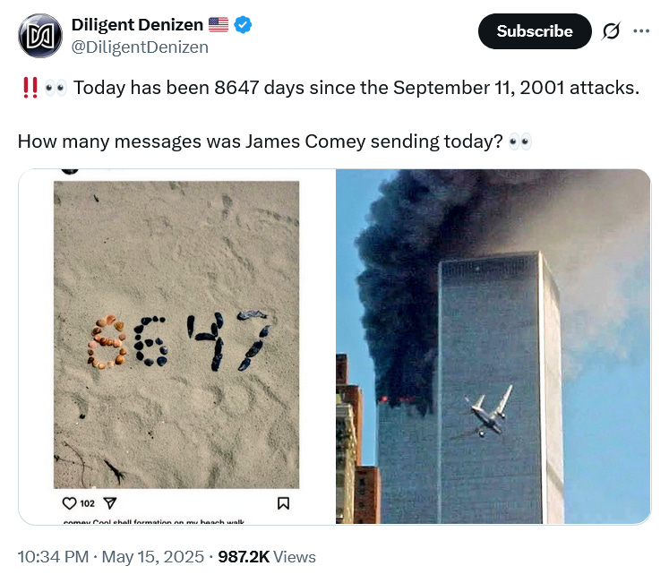 Complicating the question of context are observations by some on social media that, at the time Comey made the post, it had been 8647 days since the 9/11 attack on the World Trade Center.