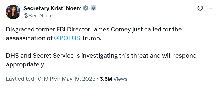 Why are President Trump’s people claiming Comey’s social media posting is something it isn’t? For the very simple reason that it is handy political theater—and as the rage postings across social media prove, effective political theater. Tulsi Gabbard going on Fox News calling for Comey’s arrest is just as performative as the Notes included above.
