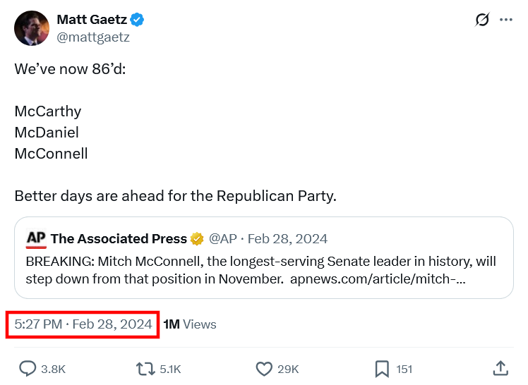 No more than Matt Gaetz was suggesting Senator Mitch McConnell was killed in 2024.