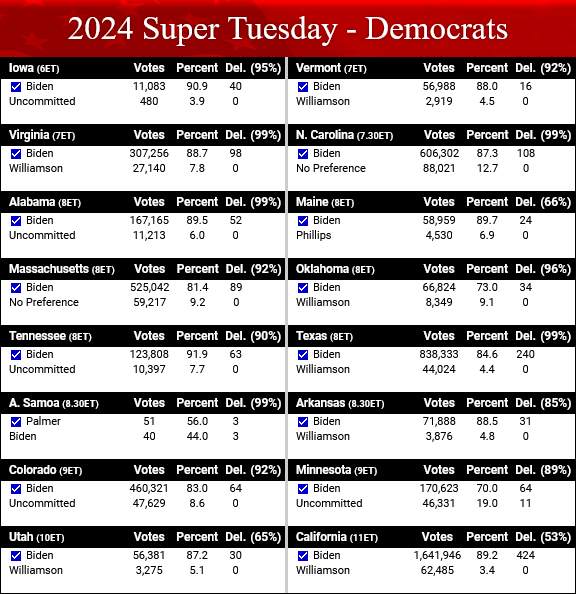 Ironically, although both Trump and Biden dominated the Super Tuesday results, neither candidate made a clean sweep of their respective primaries.