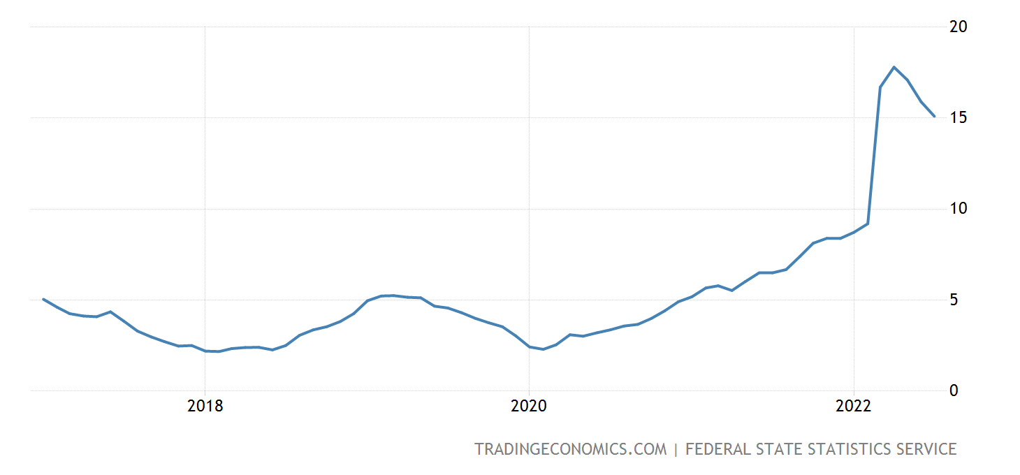 The economic data is drawn from the economic website Trading Economics, which in turn references Russian sources such as Russia’s Federal State Statistics Service (Rosstat). Direct access to Russian data sources has become problematic in recent months, potentially due to the war.