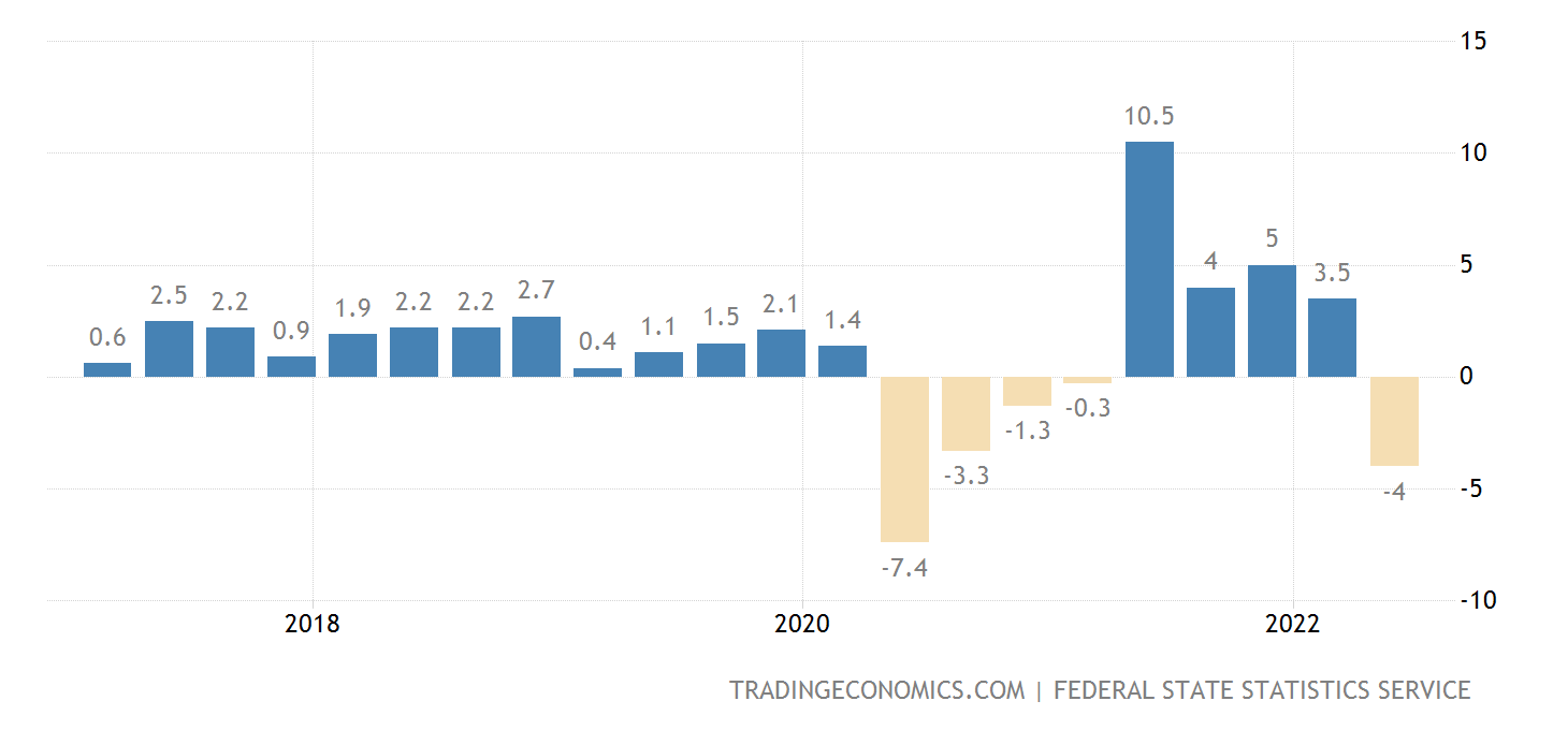 After expanding 3.5% in the first quarter of 2022, in the second quarter Russia’s economy shrank at a 4% annualized rate.