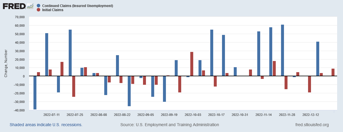 Still, it should be noted that the weekly change for both initial and continuing claims has been negative for the majority of the second half of 2022—a decline in unemployment claims is an unambiguous bit of good news.