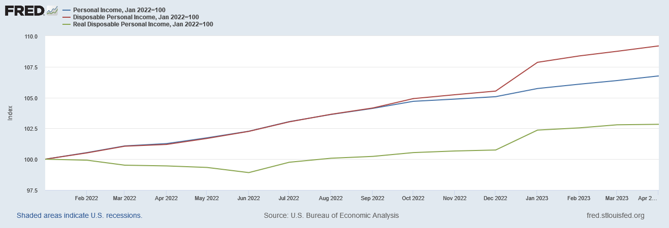 Since January of 2021, real disposable income has actually fallen 9%, while consumer prices have risen between 12.7% (PCE metric) and15.3% (CPI metric).
