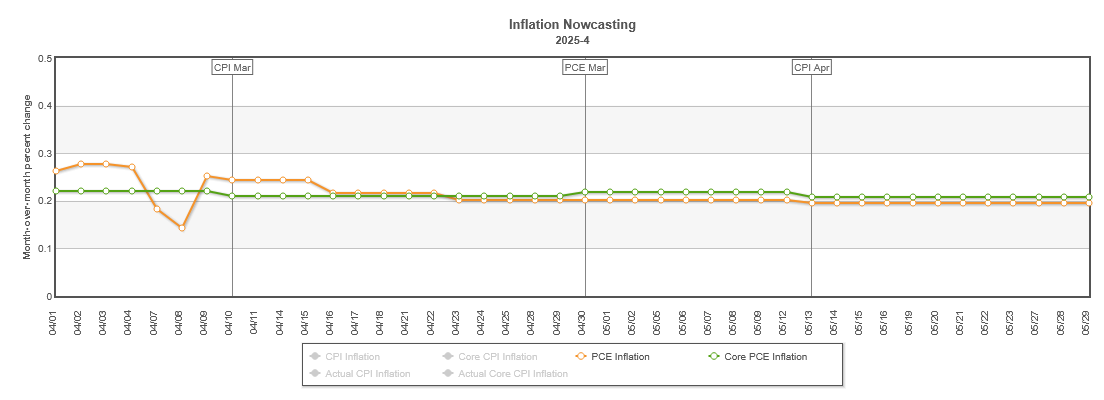 The Cleveland Federal Reserve’s nowcast on inflation is projecting further inflation declines in the Personal Consumption Expenditures Price Index for April