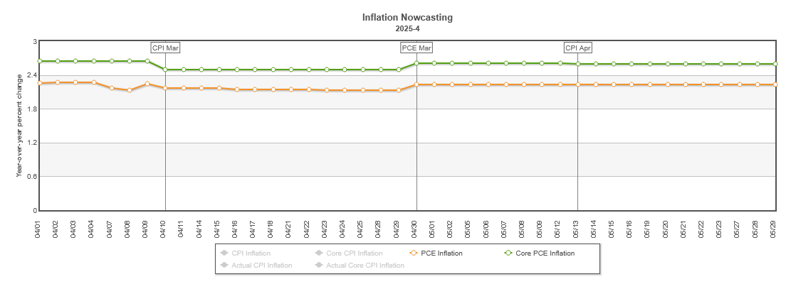 Year on year, the Cleveland Fed is projecting the PCEPI will decline at both the headline and core levels for April, coming in at 2.23% and 2.60%, respectively.