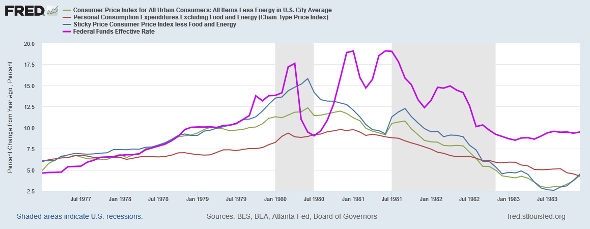 If we look at various inflation gauges and overlay shifts in the federal funds rate during the Volcker Recessions, we see the federal funds rate was higher than the consumer price inflation rate before the rate hikes.