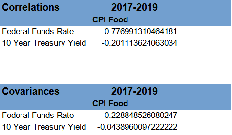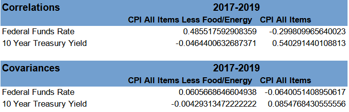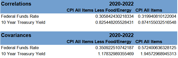Additionally, taking the correlation coefficients at face value, the positive correlations between consumer price inflation and both the Federal Funds rate and 10 Year Treasury yields implies that as interest rates rise, consumer price inflation gets worse. The correlation we want to see would be negative, so that as interest rates rise, inflation shrinks and trends down. We are not seeing that.