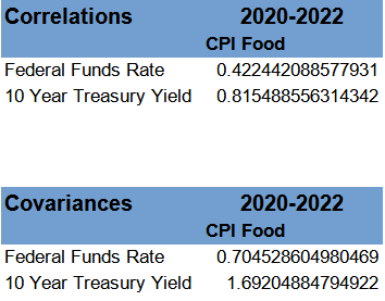 However strong the correlation between interest rates and food price inflation was before 2020, since 2020 the correlation with the Federal Funds Rate in particular has diminished, and the correlation with 10 Year Treasury yields has inverted, from negative to positive—which if anything suggests that hiking interest rates makes food price inflation worse.