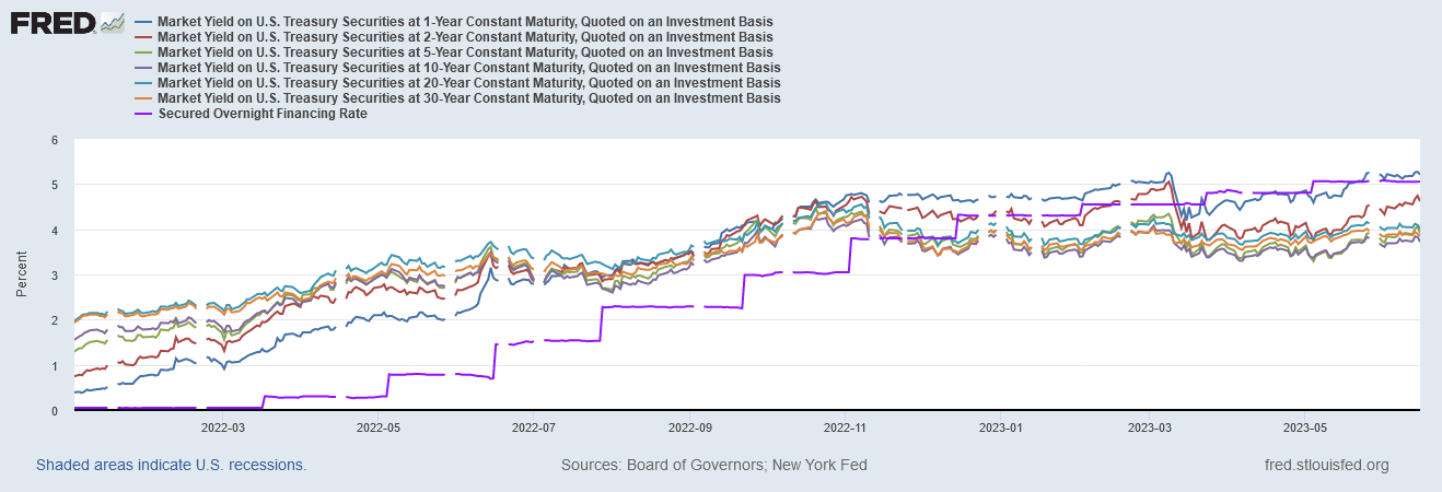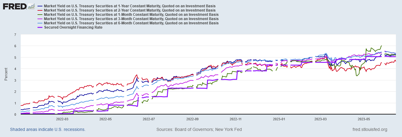 This has happened even as short-term treasury yields have slowly moved upward, and are higher now than they were just before they reversed at the beginning of March around the time that SVB collapsed.