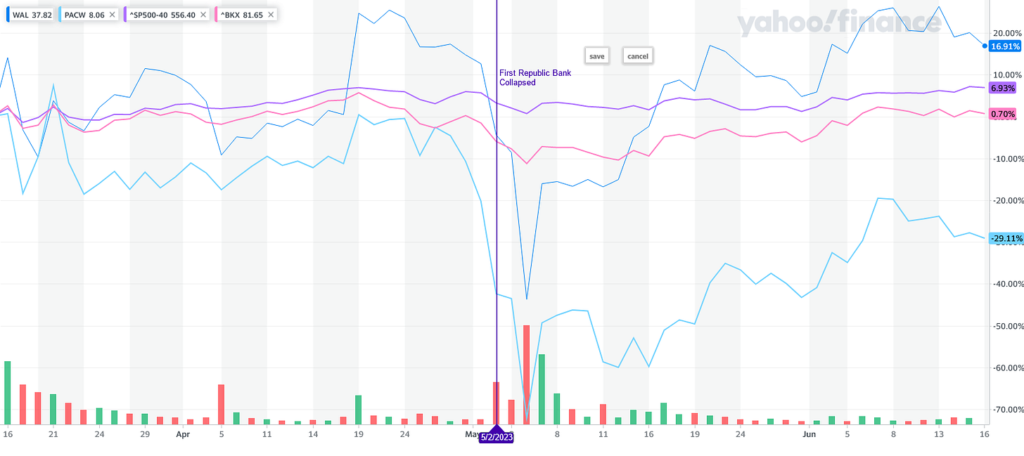 Wall Street seems also to be breathing a bit easier on banking prospects. In the wake of SVB and First Republic, it was almost a foregone conclusion that banks such as PacWest and Western Alliance were queued up to fall with one foot already in their corporate graves.