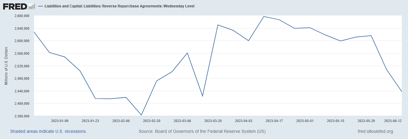 As we have already seen, however, this outcome is almost entirely in the Fed’s hands. If Powell pushes to hard on the federal funds rate, deposit outflows will resume and reverse repo activity will rise again. Deposit outflows, if sustained, will provoke first a liquidity crisis and then a banking crisis. With the bank failures that have happened this year we have already seen how that sequence of events plays out—not well.
