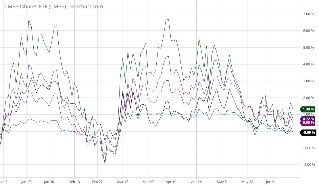 Fixed income exchange traded funds, such as the CMBS ETF for corporate mortgage backed securities, have been steadily losing value since April.