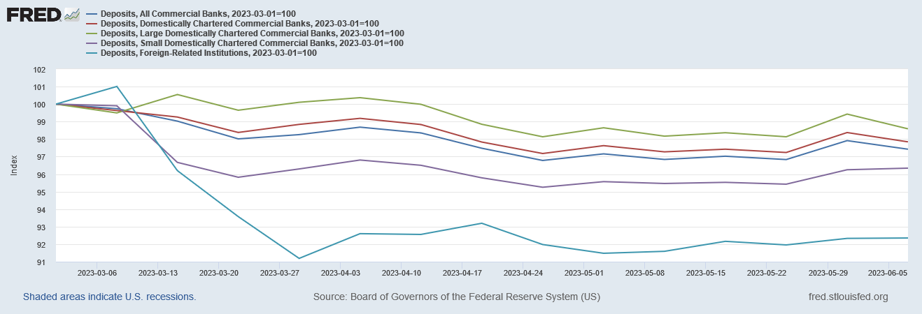 It is also worth noting that deposits at small banks have increased for the past two weeks, which we can see clearly if we index deposits to March 1.